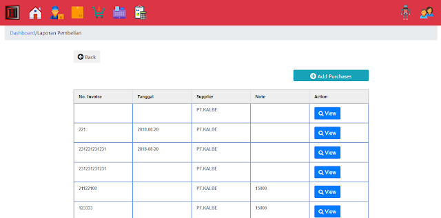 anda dapat melakukan cek laporan pembelian detail anda pada menu laporan , klim menu laporan selanjutnya anda klik untuk fitur menu laporan pembelian detail disini. setelah anda klik laporan pembelian detail maka system software program aplikasi mesin kasir online ini akan muncul tampilan display form laporan pembelian detail anda. klik view untuk melihat detail transaksi pembelian anda. dan anda dapat melakukan pembelian langsung via menu laporan ini dengan cara add purchase untuk melakukan pembelian produk guna menambah modal awal anda dan jumlah stok produk anda.