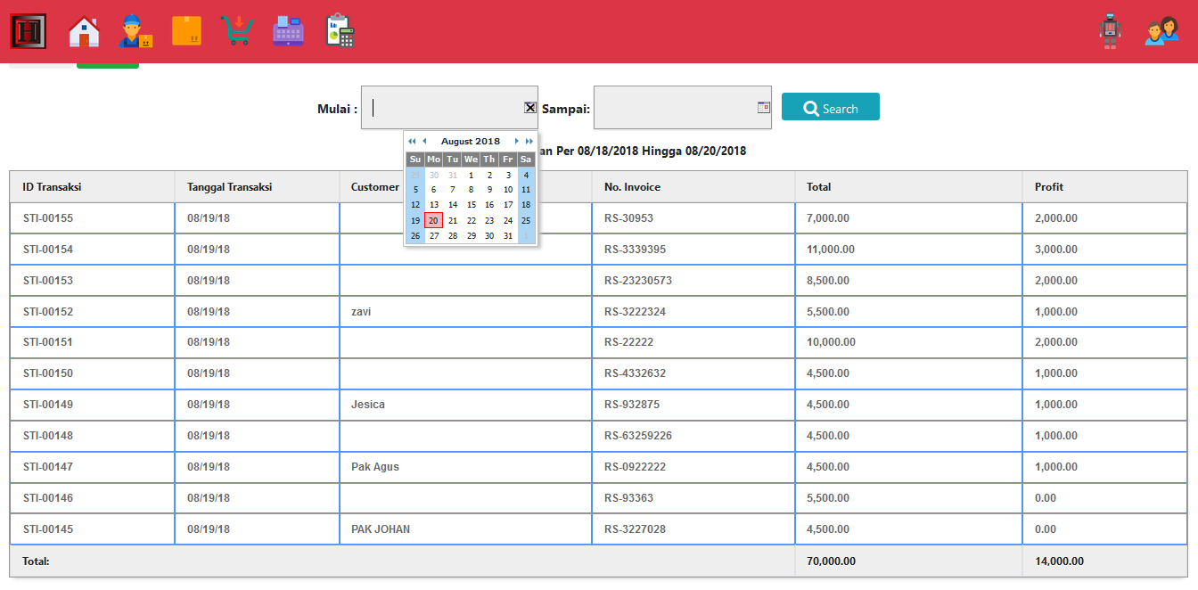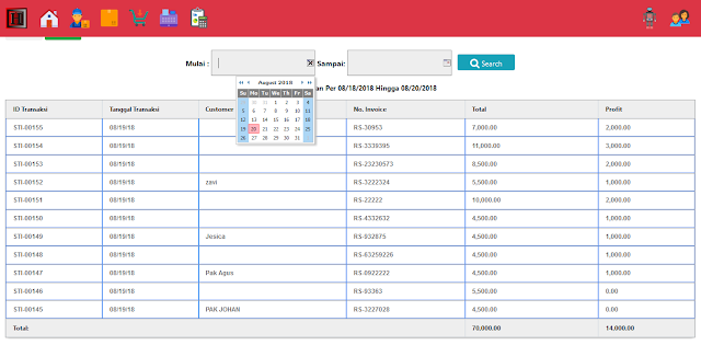 untuk mengetahui laporan penjualan per periode disini anda dapat melakukan cek laporan via menu laporan kemudian anda dapat memilih atau klik mennu laporan penjualan per periode. selanjutnya system software program aplikasi mesin kasir online invoice ini akan menampilkan form laporan yang anda butuhkan. anda tinggal klik pada menu tanggal awal dan masukan tanggal awal laporan penjualan yang anda inginkan selanjutnya masukan tanggal akhir dari periode laporan yang anda butuhkan selanjutnya klik serach maka secara otomatis mesin kasir online invoice ini akan menampilkan list detail penjualan per periode anda, pada laporan penjualan per periode ini anda dapat cek laporan per hari per minggu per bulan pertahun sesuai dengan kebutuhan usaha anda.