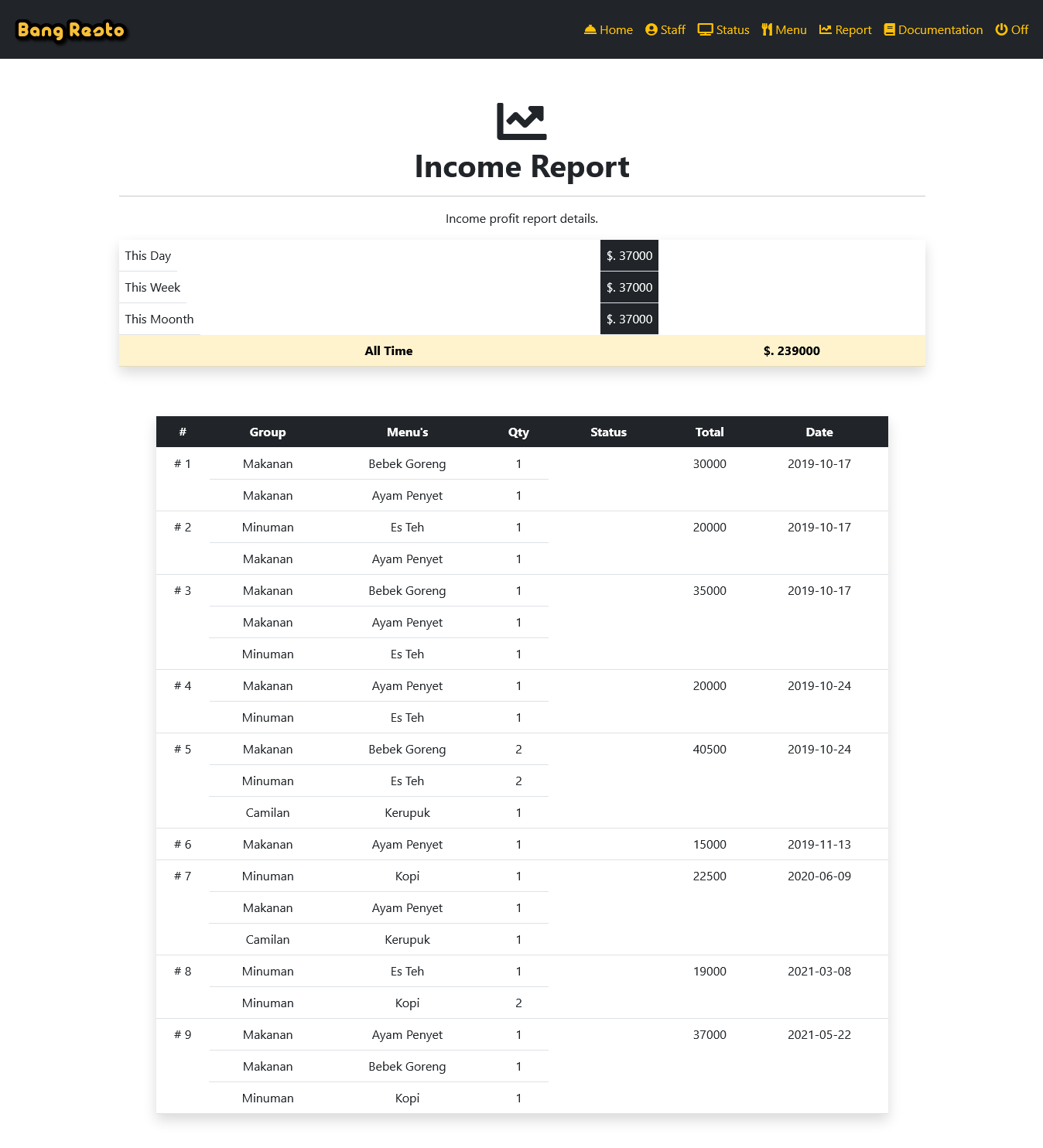 For check status and total bill customer payment you can see on status menu, just click on status menu now you can see all bill by customer order in here. very easy for make cashier transaction with status menu.