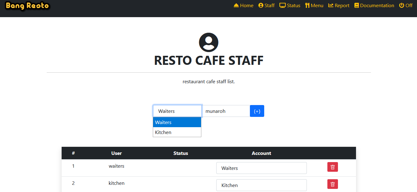Now for accsess on kitchen you need login with kitchen apps and user kitchen, logout form waiters app, then back on homepage area then select staff menu.