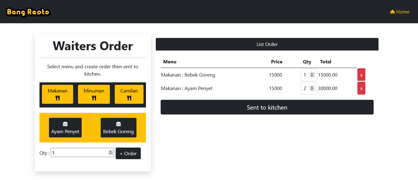For create and note customer order you can click on menu, then select what customer order in here, for sent to kitchen you need to click sent to kitchen button, this will automaticly sent on kitchen display apps.