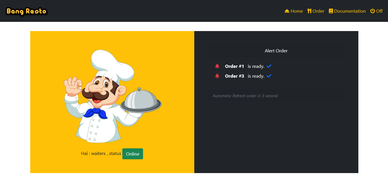 On waiters app after login you can see order alert display for reminder customer order in this menu.